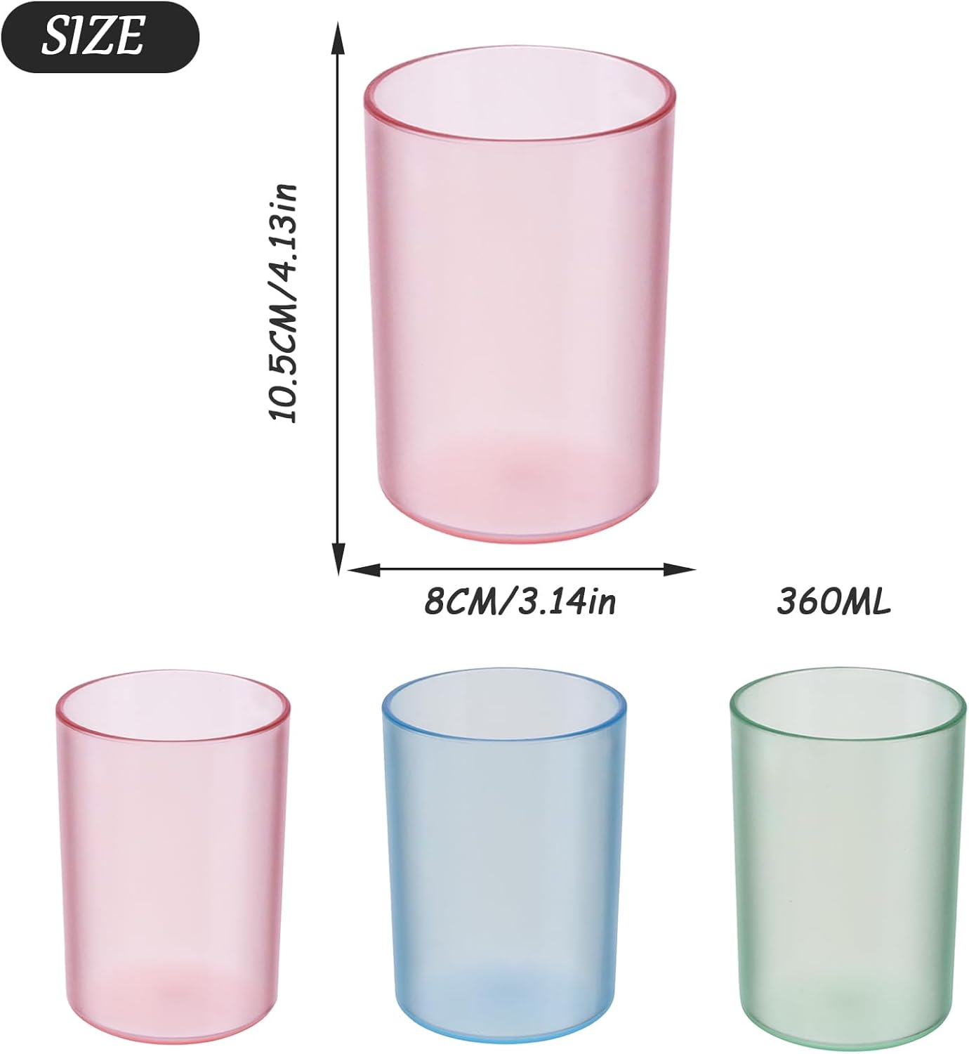 • Perfect Size: The toothbrush cup has a height (4.1 inches), a width at the bottom (2.3 inches) and a width at the top (2.7 inches). The cups are wide in the body and narrow at the bottom, allowing them to be stacked and stored without taking up space