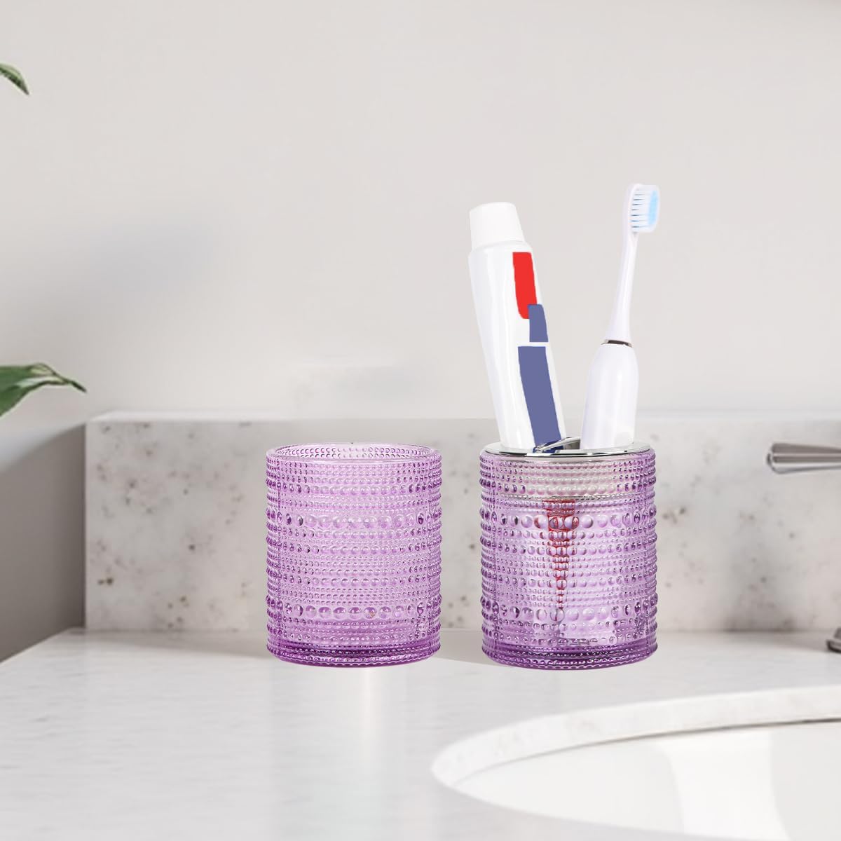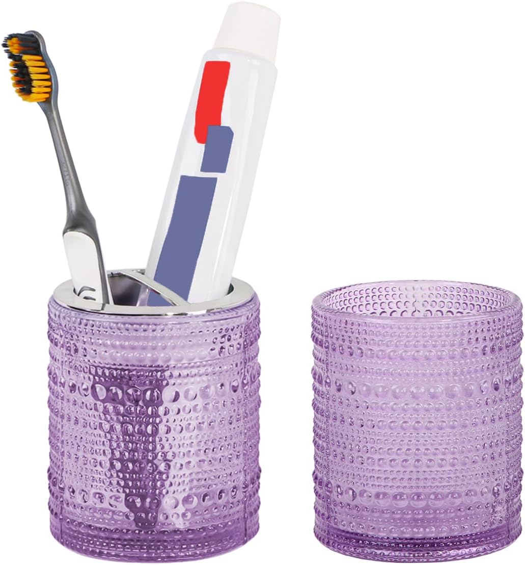 Purple Toothbrush Holders for Bathrooms, Glass Toothbrush Holder with 2 Slot Divider, 10oz Bathroom Tumbler and Mouthwash Cup, Tooth Brush Holder for Brushes, Toothpaste